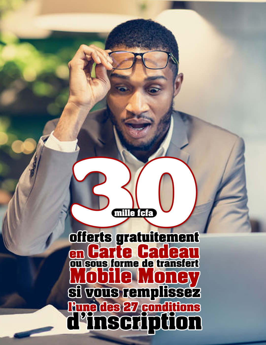 En vous inscrivant, vous pouvez obtenir GRATUITEMENT des Cartes Cadeaux ou des tranferts Mobile Money d'une valeur de 30.000 Fcfa. Pour en profiter, vous devez vous inscrire en choisissant d'abord votre Pays et/ou votre Ville ou Commune de résidence.